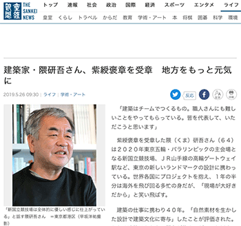 隈研吾さんが、紫綬褒章を受章したことを伝えている記事が、産経ニュースに掲載されています。