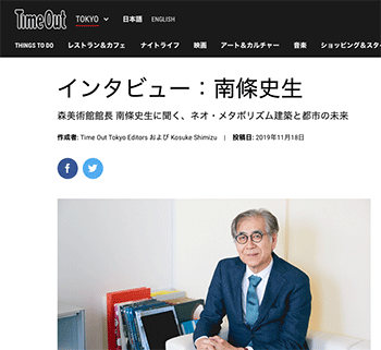 「森美術館館長 南條史生に聞く、ネオ・メタボリズム建築と都市の未来」という南條史生氏にインタビューしている記事が、Time Out Tokyoに掲載されています。