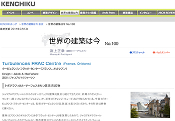 建築ジャーナリスト&エディターの淵上正幸氏による特集記事「世界の建築は今 」にて、ジャコブ&マクファーレン設計による「タービュランス・フラック・センター 」(フランス)が取り上げられています。