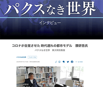 「コロナが自覚させた 時代遅れの都市モデル 隈研吾氏」という隈研吾氏にインタビューしている記事が、日本経済新聞に掲載されています。