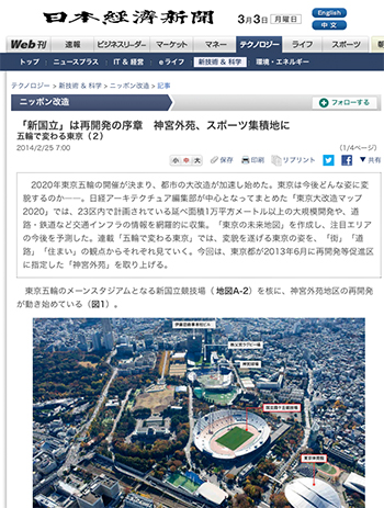 東京都が2013年6月に再開発等促進区に指定した「神宮外苑」をテーマにした記事「「新国立」は再開発の序章 神宮外苑、スポーツ集積地に 」が日本経済新聞に掲載されています。