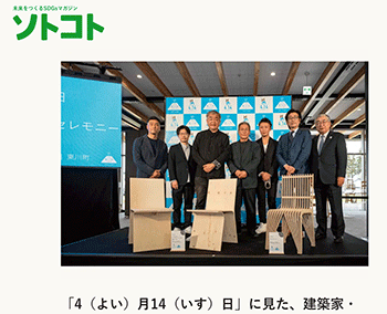 「「4(よい)月14(いす)日」に見た、建築家・隈 研吾さんと北海道・東川町の未来へのアプローチ。」という隈研吾さんと北海道・東川町と連携して始めた「『隈 研吾×東川町』KAGU デザインコンペ」寄せたメッセージなどをまとめている記事が、ソトコトオンラインに掲載されています。