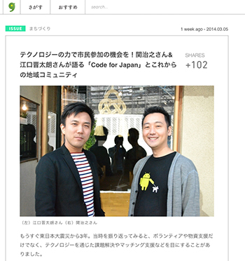 「sinsai.info」を創設し、昨年立ち上がった「Code for Japan」の代表も務める関治之さんとウェブマガジン「マチノコト」を運営する江口晋太朗さんにテクノロジーとこれからの地域コミュニティの形についてインタビューした記事「テクノロジーの力で市民参加の機会を!関治之さん&江口晋太朗さんが語る「Code for Japan」とこれからの地域コミュニティ」が、グリーンズに掲載されています。