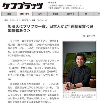 プリツカー賞を主宰する米ハイアット財団は3月24日(日本時間25日)、2014年の同賞を建築家の坂茂氏に授与すると発表したそうです。