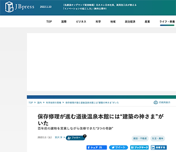 アラカルト「保存修理が進む道後温泉本館には“建築の神さま”がいた」という宮沢洋氏による記事が、 JBpressに掲載されています。