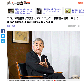 「コロナで建築はどう変わっていくのか? 隈研吾が語る、ひとの住まいと建築がこの2年間で変わったこと」という隈研吾氏に話を聞いている記事が、デイリー新潮に掲載されています。