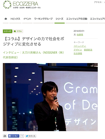「目には見えないものをデザインしたい」と語り、デザインのオープンソース化にも取り組んでいるというNOSIGNER代表の太刀川英輔さんにデザインが社会を変える可能性についてインタビューしている記事「デザインの力で社会をポジティブに変化させる」が、エコポータルに掲載されています。