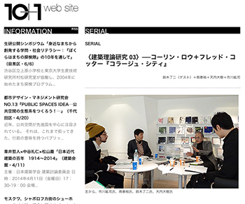 書籍「コラージュ・シティ」をテーマにした鈴木了二氏(建築家)、南泰裕氏(建築家)、天内大樹氏(美学芸術学、建築思想史)、市川紘司氏(中国近現代建築史)による対談記事「建築理論研究 03─コーリン・ロウ+フレッド・コッター『コラージュ・シティ』」が、10+1 web siteに掲載されています。