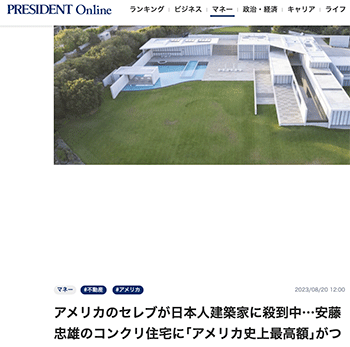 「アメリカのセレブが日本人建築家に殺到中…安藤忠雄のコンクリ住宅に「アメリカ史上最高額」がついたワケ」という記事が、PRESIDENT Onlineに掲載されています