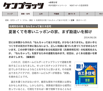 住宅建築家の松尾和也氏によるコラム「夏暑くて冬寒いニッポンの家、まず勘違いを解け」が、ケンプラッツに掲載されています。