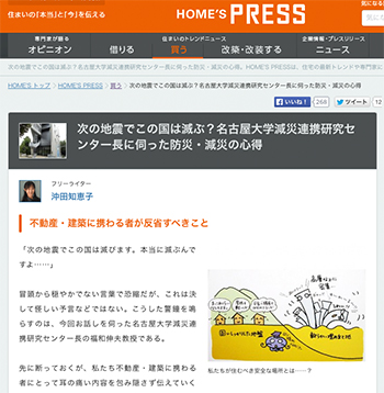 名古屋大学減災連携研究センター長の福和伸夫教授へのインタビューなどをまとめた記事「次の地震でこの国は滅ぶ?名古屋大学減災連携研究センター長に伺った防災・減災の心得」が、HOME’S PRESSに掲載されています。