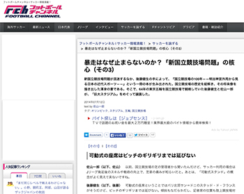 1964年の東京五輪を国立競技場で観戦していた後藤健生氏と佐山一郎氏が、新国立競技場問題をめぐって論議した内容をまとめた記事「暴走はなぜ止まらないのか?「新国立競技場問題」の核心」が、フットボールチャンネルに3回にわたって掲載されています。