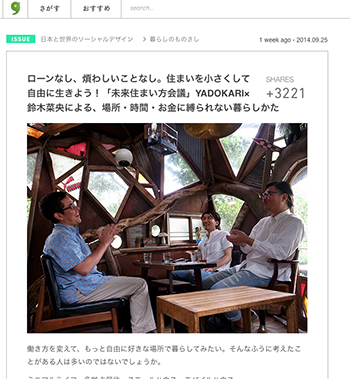 これからの豊かさを考え実践するメディア「未来住まい方会議」を運営するYADOKARIのさわだいっせいさん、ウエスギセイタさんとgreenz.jp代表の鈴木菜央さんが、これからの暮らしかたについて話をしたという記事「ローンなし、煩わしいことなし。住まいを小さくして自由に生きよう!「未来住まい方会議」YADOKARI×鈴木菜央による、場所・時間・お金に縛られない暮らしかた」がグリーンズに掲載されています。
