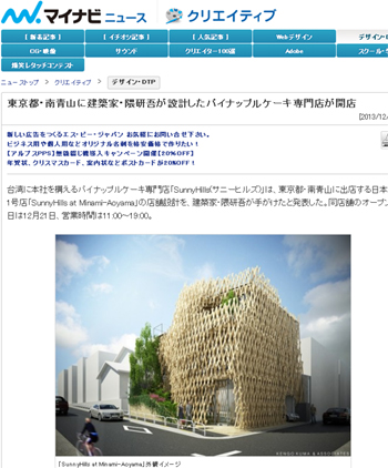 建築隈研吾(建築家)が店舗設計を手がけたパイナップルケーキ専門店「SunnyHills at Minami-Aoyama」が、東京、南青山に12月21日にオープンするそうです。