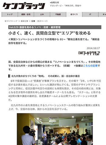 「小さく、速く、民間自立型で“エリア”を攻める(「敷地主義を捨てる」「補助金依存を脱却する」)前編」および「民間の「小」と公共の「大」、不動産活用の連携へ(官も民も分け隔てなく」「稼いで、利益を還元」)(後編)」という北九州市・小倉の事例を紹介している記事がケンプラッツに掲載されています。