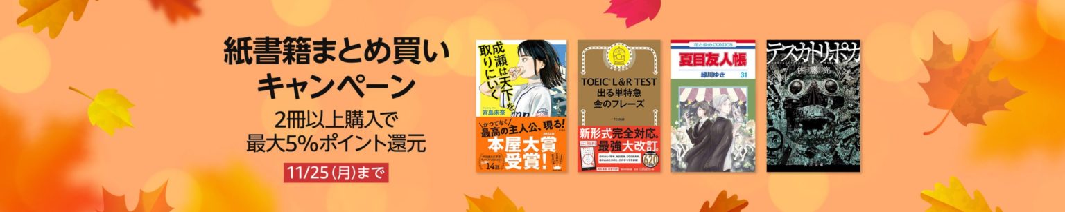 Amazon Booksにて、2024年10月25日(金)から11月25日(月)まで、紙書籍のまとめ買いキャンペーンが開催されています。