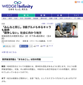 →『「みんなと同じ」B級グルメもゆるキャラも限界 「競争しない」社会に向かう地方 地域活性化の現実を見よ(2)木下斉×飯田泰之 (全4回) WEDGE Infinity(ウェッジ)』