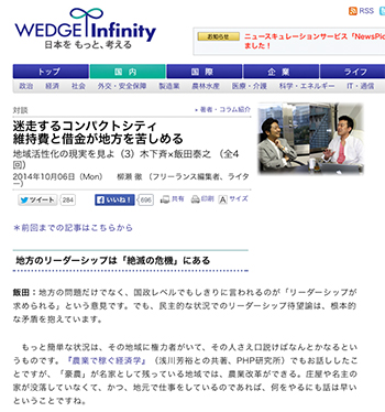 →『迷走するコンパクトシティ 維持費と借金が地方を苦しめる 地域活性化の現実を見よ(3)木下斉×飯田泰之 (全4回) WEDGE Infinity(ウェッジ)』