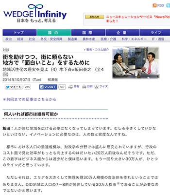 木下斉氏と飯田泰之氏による対談記事「街を助けつつ、街に頼らない 地方で「面白いこと」をするために 地域活性化の現実を見よ(4)木下斉×飯田泰之 」が、WEDGE Infinityに掲載されています。