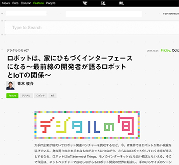 ユカイ工学の青木俊介代表に話を聞いた記事「ロボットは、家にひもづくインターフェースになる~最前線の開発者が語るロボットとIoTの関係~」が、電通報に掲載されています。