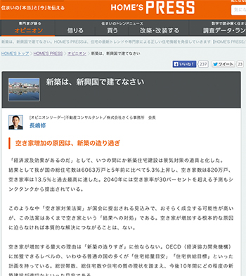 まちづくり長嶋修氏(不動産コンサルタント/株式会社さくら事務所会長)によるオピニオン記事「新築は、新興国で建てなさい」が、HOME’S PRESSに掲載されています。