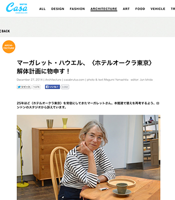 ジャーナル「マーガレット・ハウエル、〈ホテルオークラ東京〉解体計画に物申す!」というファッションデザイナーのマーガレット・ハウエル氏へのインタビュー記事が、casabrutus.comに掲載されています。
