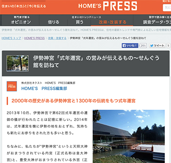 「伊勢神宮「式年遷宮」の営みが伝えるもの~せんぐう館を訪ねて」という記事が、HOME’S PRESSに掲載されています。