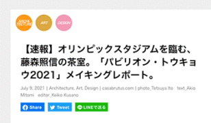 日本建築 オリンピックスタジアムを臨む、藤森照信の茶室。「パビリオン・トウキョウ2021」メイキングレポート。( Casa BRUTUS) 「オリンピックスタジアムを臨む、藤森照信の茶室。「パビリオン・トウキョウ2021」メイキングレポート。」という藤森照信氏にインタビューしている記事が、 Casa BRUTUSに掲載されています。 →『オリンピックスタジアムを臨む、藤森照信の... 2021.08.05 日本建築ニュース@アマゾンリンク切れ(adsystem)