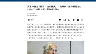 日本建築 茶室の魅力「極小に宿る極大」 建築家・藤森照信さん(日本経済新聞) 「茶室の魅力「極小に宿る極大」 建築家・藤森照信さん」という藤森照信さんに話を聞いている記事が、日本経済新聞に掲載されています。 →『茶室の魅力「極小に宿る極大」 建築家・藤森照信さん』 2022.01.20 日本建築ニュース@アマゾンリンク切れ(adsystem)