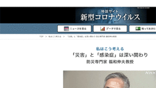 都市防災 私はこう考える 「災害」と「感染症」は深い関わり /防災専門家 福和伸夫教授 (NHK特設サイト) 「私はこう考える 「災害」と「感染症」は深い関わり」という防災専門家の名古屋大学・福和伸夫教授に話を聞いている記事が、NHK特設サイトに掲載されています。 →『私はこう考える 「災害」と「感染症」は深い関わり 』 2020.05.04 都市防災ニュース@アマゾンリンク切れ(adsystem)
