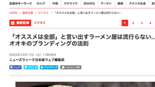 「「オススメは全部」と言い出すラーメン屋は流行らない...佐藤オオキのブランディングの法則」という記事が、ニューズウィーク日本版に掲載されています。 →『ススメは全部」と言い出すラーメン屋は流行らない...佐藤オオキのブランディングの法則』...