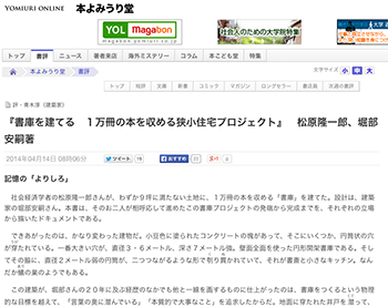 松原隆一郎氏、堀部安嗣氏による「書庫を建てる 1万冊の本を収める狭小住宅プロジェクト」の書評が本よみうり堂 にて掲載されています。 →『 記憶の「よりしろ」/ 『書庫を建てる 1万冊の本を収める狭小住宅プロジェクト』 松原隆一郎、堀部安嗣著...